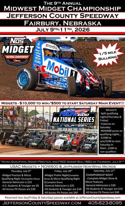 On July 9-11, 2026, Jefferson County Speedway in Fairbury, Nebraska will once again host to the 9th Annual Riverside Chevrolet Midwest Midget Championship presented by Westin Packaged Meats and Schmidt's Sanitation featuring the cars and stars of the USAC National Midget Series competing for a $40,000 purse! This years show will again coincide with the Jefferson County Fair!